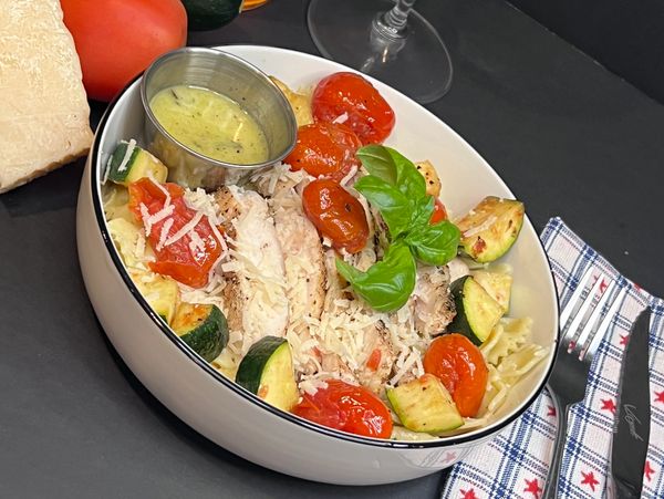 Some dishes just feel like home — this one shines with that kind of comfort. What started as a summer special quickly became one of our most-requested meals. We grill the chicken, roast the veggies until golden, then toss everything with bowtie pasta and our house-made lemon-basil vinaigrette. The result is bright, fresh, and full of the kind of flavor that keeps folks coming back week after week.